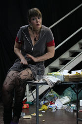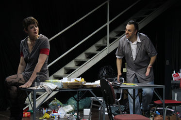 A encenação se passa numa sala usada como refeitório pelos funcionários de uma empresa. Abarrotada de lixo e sujeira, ela simboliza a vida destes dois personagens. A luz é fria, o ambiente inóspito, claustrofóbico. Ali eles terão de se enfrentar, olhos nos olhos. Não há refugio. E o público participa deste encontro como se estivesse dentro da sala.