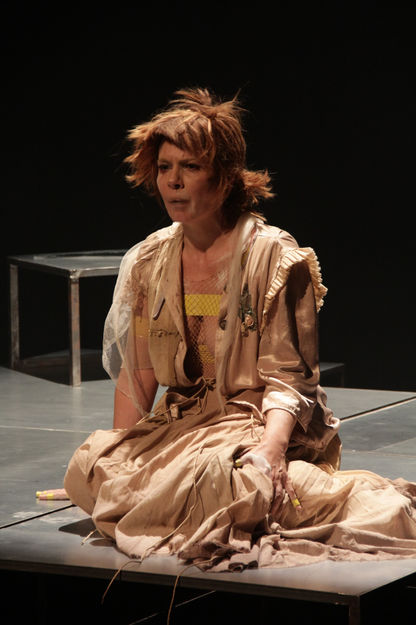 Cercados de cacos de espelhos, as três personagens recortam a si próprio através da composição cênica, seja a partir da utilização do cenário (de Marisa Bentivegna) – uma plataforma que possibilita encaixes e desencaixes, permitindo que as figuras se mantenham numa reorganização constante, própria e espacial – ou da criação de imagens corporais e coreografias que contrastam delicadeza e tensão; o trabalho corporal de Marina Caron explora e expande os corpos possíveis do ator e das atrizes, também em permanente descoberta. Desse modo, a encenação acompanha a fragmentação do texto, ao mesmo tempo em que aproveita o jogo com as distâncias entre as personagens, criando relações que, ainda que fisicamente impossíveis, transmitem para o público a sugestão do peso (ou da leveza) de cada encontro.